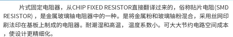 片式固定電阻器,從Chip Fixed Resistor直接翻譯過來的,俗稱貼片電阻(SMD Resistor) ,是金屬玻璃釉電阻器中的一種。是將金屬粉和玻璃釉粉混合,采用絲網(wǎng)印刷法印在基板上制成的電阻器。耐潮濕和高溫, 溫度系數(shù)小??纱蟠蠊?jié)約電路空間成本,使設(shè)計更精細化。